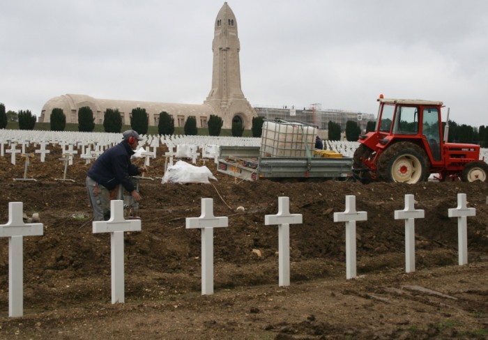 IDÉE. Partir d’un jeune travailleur qui remplace aujourd’hui des croix à Douaumont et songer à celui qui avait le même âge et qui est dessous.